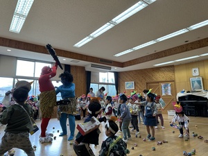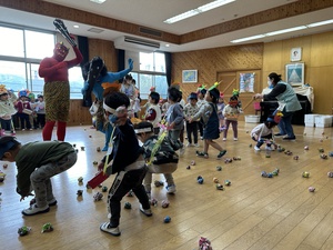 みんなで力を合わせて豆をまいて鬼を退治しました!