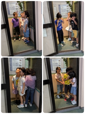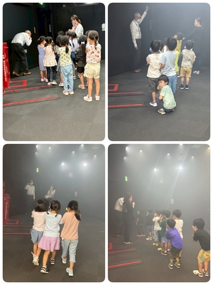 次に台風の風の体験をしました。台風の日は危ないので外に出ないこと、川に近づかないことを約束しました。