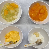 今回のおやつは4種のゼリー!みかん、もも(杏仁豆腐)、マンゴー、フルーツミックス!